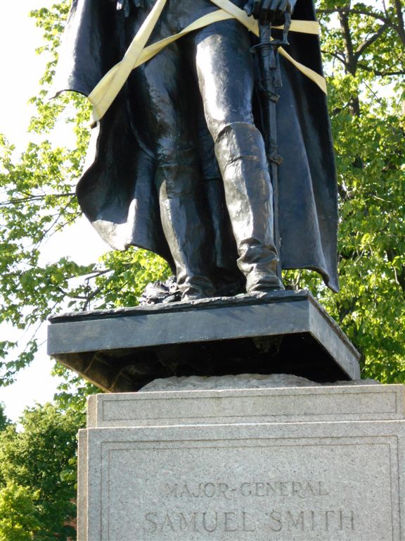 The Samuel Smith Monument was one of several sculptural monuments commissioned in recognition of Baltimore’s Centennial of the War of 1812. General Smith was commander of the Maryland forces that repulsed and defeated the British in the Battle of Baltimore at North Point and at Fort McHenry on September 12-14, 1814. Previously, Smith had been a hero of the Revolutionary War. After his exemplary military career, he continued his public service by serving forty years in Congress including becoming President of the U.S. Senate, serving as Secretary of the U.S Navy, and at the age of 80 serving as the Mayor of Baltimore.